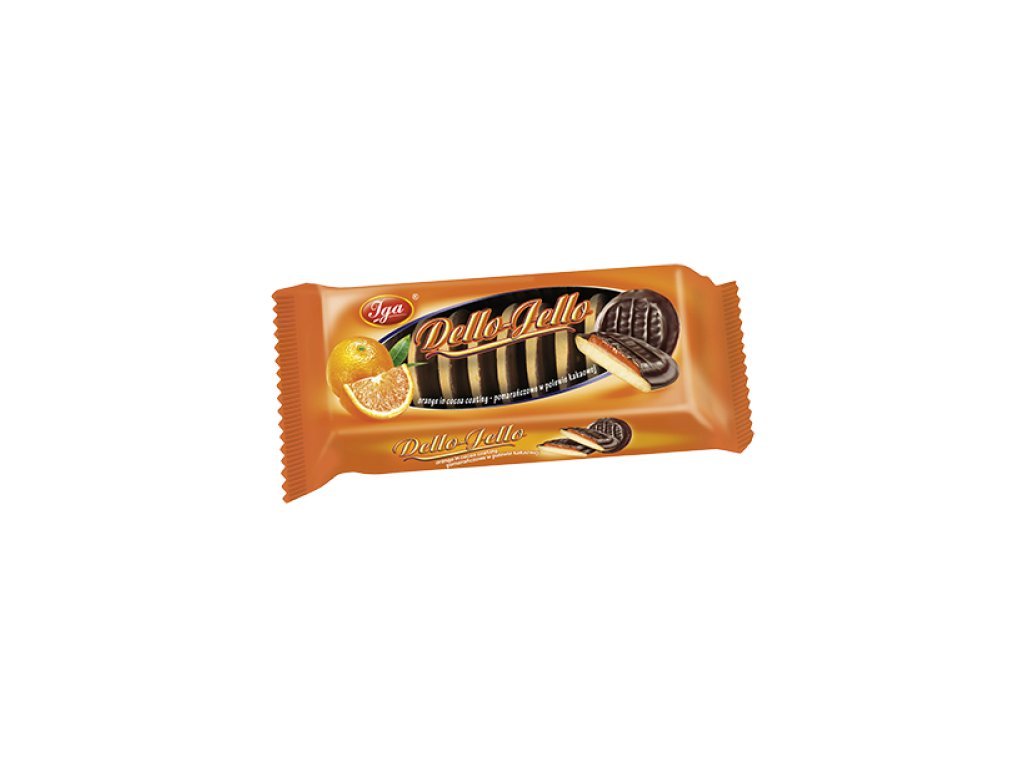 Zloženie: Pomarančové želé 52% (glukózový sirup, glukózo-fruktózový sirup, voda, cukor, zahustená pomarančová šťava (1,2%), želírujúca látka (pektín), regulátor kyslosti (kyselina citrónová, citrát sodný), aróma, farbivo (karotény)); piškót 36% (PŠENIČNÁ múka, cukor, voda, zemiakový škrob, sušená VAJEČNÁ hmota, glukózo-fruktózový sirup, repkový olej, invertný cukrový sirup, sušené odtučnené MLIEKO, VAJEČNÝ albumín v prášku, zvlhčovadlo (glycerol), kypriace látky (uhličitan sodný, uhličitan amónny), maltodextrín, soľ, aróma, farbivo (karotény), emulgátory (E475, E471)); kakaová poleva 12% (cukor, čiastočne hydrogenovaný (palmový olej), kakaový prášok so zníženým obsahom tuku (1,5%), emulgátory (SÓJOVÝ lecitín, E476, E492), aróma).