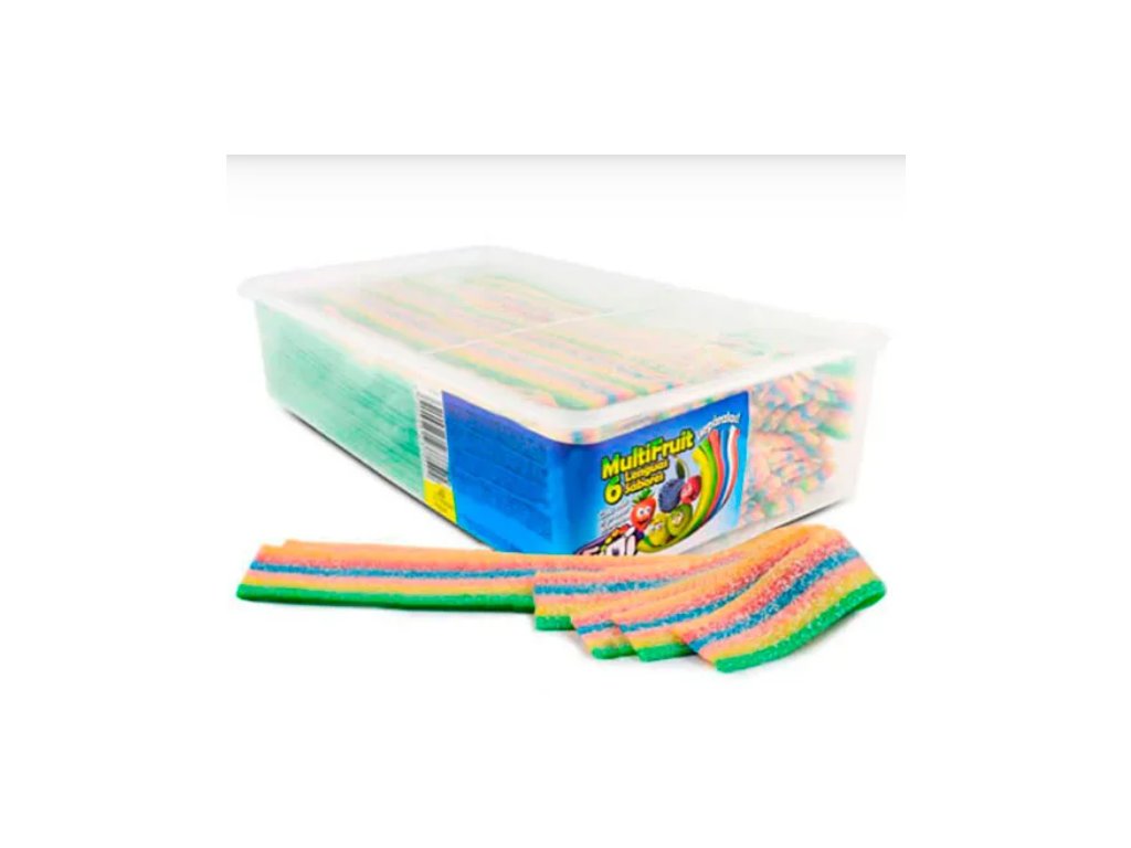 Zloženie: glukózový a fruktózový sirup, cukor, pšeničná múka(lepok), škrob, kyselina jablčná E296, rastlinný palmový tuk, kyselina citrónová, E330, E270, kyselina mliečna, regulátory kyslosti: mliečnan sódny, citrát sódny, E325, E331, soľ, emulgátor E471, mono-a diglyceridy mastných kyselín, arómy, zvlhčovadlo: glycerol, farbivá: kukumín, košenila, brilantná modrá FCF, extrakt z papriky, oxid titaničitý, E100,E133, E163.